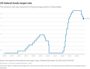 The U.S. Federal Reserve cut rates by 100 basis points (bps) from September to December 2024. However, further cuts may not be as easy to implement. While inflation is not entirely under control, another key concern is the impact of trade policies. Trump’s renewed tariff war on steel, aluminum, and Chinese imports could drive up costs, worsening inflation from the supply side.