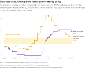The Reserve Bank of Australia (RBA) cut rates to 4.1%—its first reduction in over four years. With inflation cooling to 3.2%, rate cuts were expected. However, Australia’s strong job market still raises concerns that inflation could remain sticky. The RBA suggests that more cuts may come in the near future.