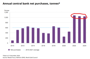 Central banks remained massive buyers, adding 1,044t in 2024—the third consecutive year of 1,000+t purchases.