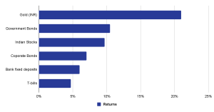 *As of 31 December 2024. Indices used: MCX Gold Index, CRISIL Corporate Bond Index, S&P BSE Sensex Total Return Index, Clearing Corp of India Liquidity Weight T-Bill Index, ICE BofA Govt Bond Index. Source: Bloomberg, World Gold Council