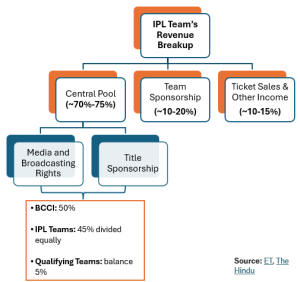 IPL teams derive 70-75% of their revenue from the central pool, which includes title sponsorships (starting with DLF in 2008, then came ViVo for a few years and now with TATA) and, most importantly, media & broadcasting rights—the biggest cash cow.