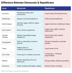 The U.S. political landscape is dominated by two major parties: the Republicans (Conservatives) and the Democrats (Liberals). Have a look at the comparison below –
