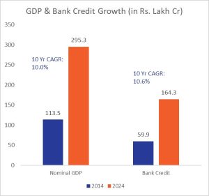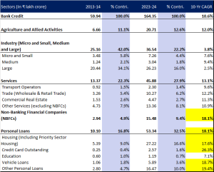 As evident in the above chart, credit growth has kept pace with overall GDP growth. However, the composition of today’s credit has shifted significantly compared to a decade ago. The types of borrowers, sectors driving demand, and sources of credit have evolved, reflecting broader changes in the Indian economy and financial landscape.