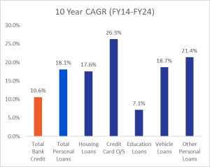 Over the past decade, NBFC borrowing from banks has grown at a CAGR of approximately 18%, closely matching the rise in personal loans.