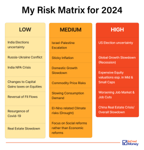 I was thinking about the different factors which could potentially spoil the party, and so I have made a list of the Top risks for 2024. This list is based on my study of the economic, geopolitical and market conditions, and while it fairly covers most of the points, it is not exhaustive. So if you feel I have missed out on any risk factor which you think is important, do write back and let me know.